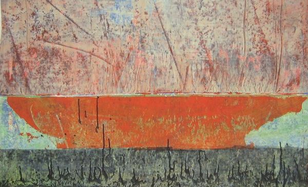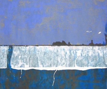 La souplesse et la légèreté de ses grands papiers encollés, facilitent ses manipulations à bout de bras: lavis, coulures, empreintes humides, vibrations sous la spatule; chaque accident est précieux et déterminant dans chaque étape de sa peinture. Elle s’élabore de strates en strates, entre rapidité du geste et vigilance, d' étonnements en recouvrements pour tendre à l'essentiel.